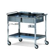 Carrello indicato per medicazioni, struttura in acciaio inox AISI 304 di spessore mm 1, piano superiore con bordi rialzati su 3 lati, posteriore e laterali, mentre il piano inferiore di spessore mm 1 con bordi rialzati sui 4 lati, che permettono di portare oggetti in maggiore sicurezza. Con gambe angolari di spessore mm 2, 2 cassetti affiancati di spessore mm 0,7, 2 portaflaconi di spessore mm 0,7 a 6 posti, portacatino in tondo di acciaio cromato di diam. mm 0,8, portabacinella cromato di forma rettangolare e 2 maniglie di spinta in tubo tondo di acciaio inox AISI 304 di diam. mm 18×1 di spessore. Completo di 4 ruote piroettanti di diam. mm 100.